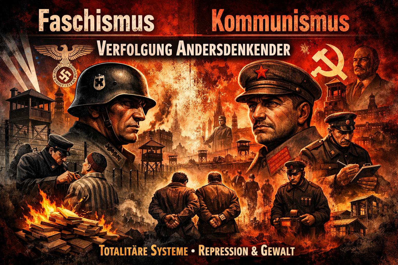 👉 Fazit: Sowohl Faschismus als auch Kommunismus waren totalitäre Systeme, die Andersdenkende systematisch verfolgten – allerdings mit unterschiedlichen ideologischen Begründungen (Rassenideologie vs. Klassenkampf). Das Ergebnis war aber ähnlich: Unterdrückung, Gewalt und die Zerstörung individueller Freiheit.
