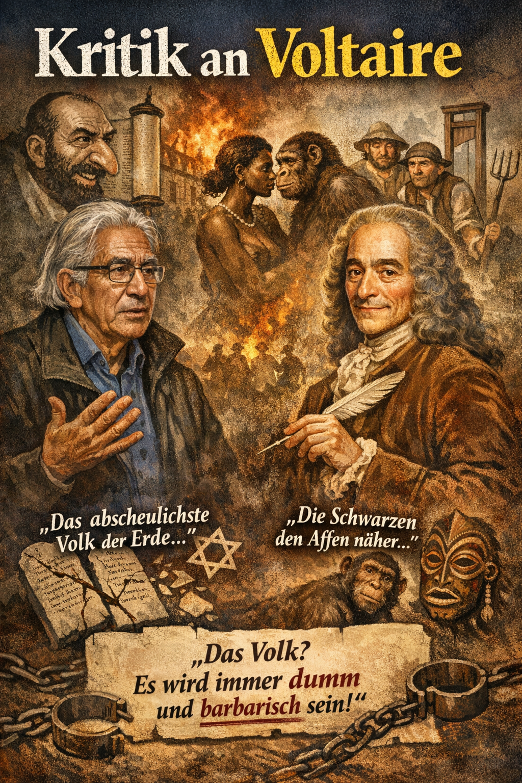 Friedenspreisträger Boualem Sansal hatte sich jemanden wie Voltaire gewünscht, weil dieser sich getraut habe, Werte wie Religion und Fanatismus anzugreifen. Herr M. kritisierte daraufhin: Die Juden waren für Voltaire „das abscheulichste Volk der Erde“, „dem verabscheuungswürdigsten Aberglauben und dem unüberwindlichsten Hass gegenüber allen Völkern“ ergeben. Nach Voltaire standen die Schwarzen den Affen näher als der weißen Menschenrasse. Er hielt es für erwiesen, dass Kopulationen zwischen schwarzen Frauen und Affenmännchen stattfanden. Echte Demokratie konnte sich Voltaire nicht vorstellen. Vom Volk sagte er: „Es wird immer dumm und barbarisch sein; es sind Ochsen, die ein Joch, einen Stachel und Heu brauchen.“